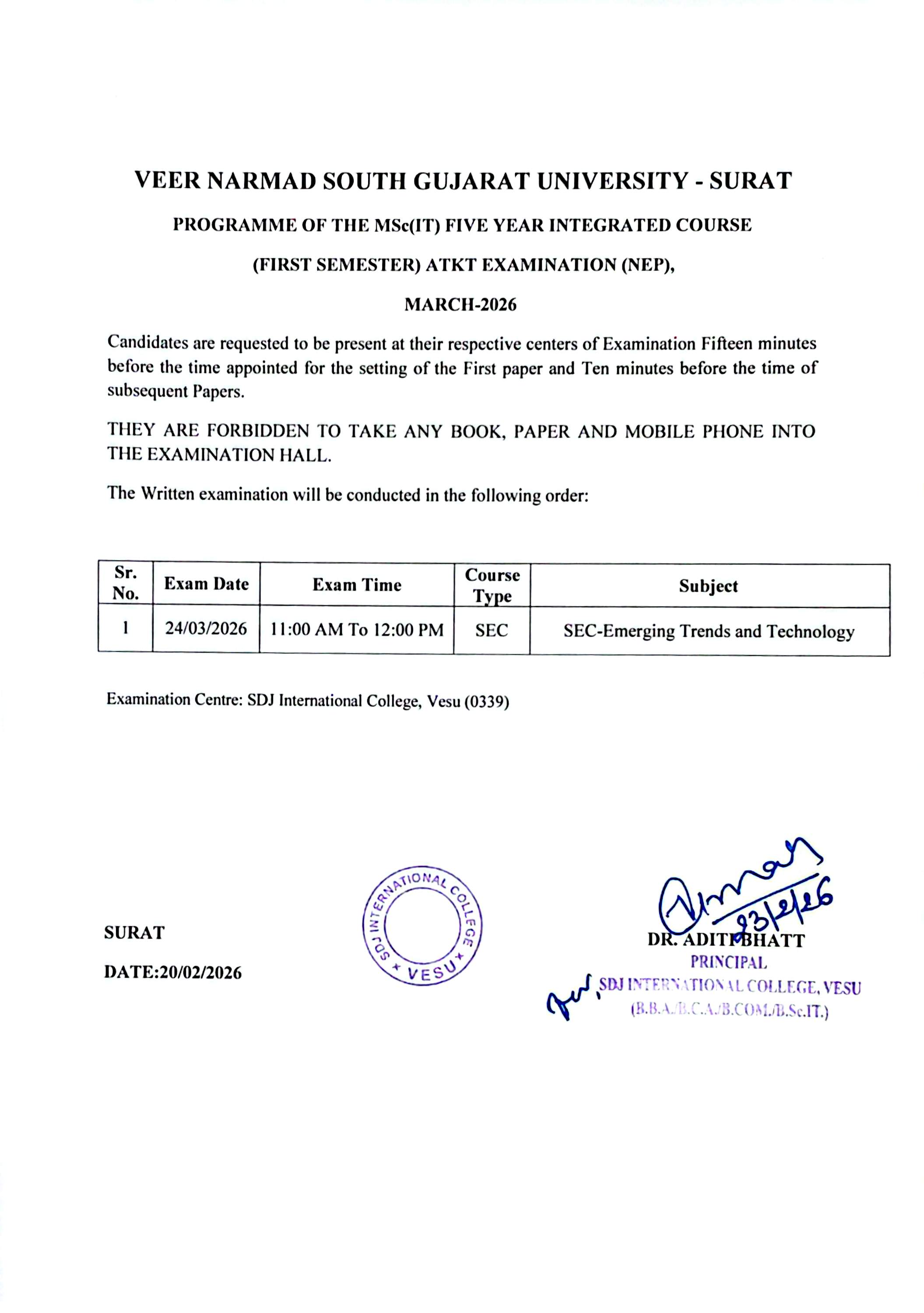 FY MSC IT VNSGU ATKT SEC Examination Mar-26 AY2025-26